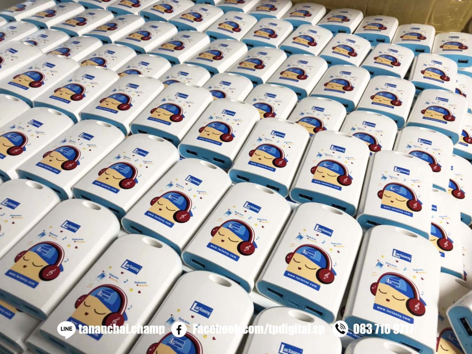 สกรีนโลโก้พาวเวอร์แบงค์ สกรีนลายลงบนพาวเวอร์แบงค์ ยี่ห้อ ELOOP ลาย VB และ Lactasoy