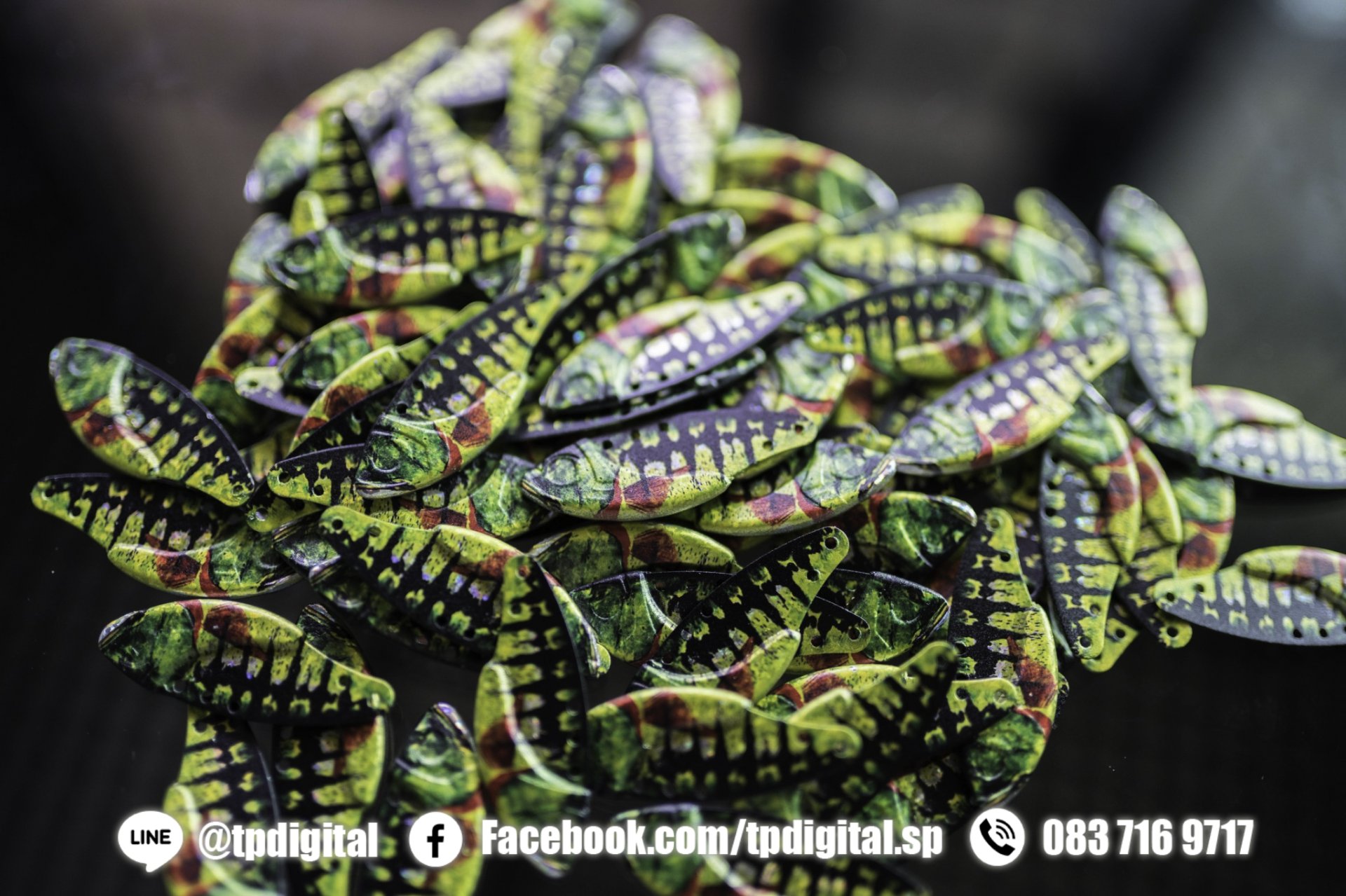 พิมพ์ลายลงบนโลหะตะกั่ว เหยื่อปลอม ทรงปลานิล พิมพ์ลายตามต้องการ พิมพ์ลายเต็มชิ้นงาน ทั้ง 2 ด้าน วัสดุเป็นโลหะตะกั่ว ทรงปลานิล สีเงิน พื้นผิวขรุขระ พิมพ์งานด้วยระบบดิจิตอล ปริ้นติ้งระบบยูวี สกรีนงานลงบน ผิวงานโดยตรง สกรีนได้ทุกสี ( ยกเว้น สีเงิน สีทอง ) ของงานพิมพ์ C M Y K W V Primer สามารถ ทำนูน เคลือบเงา เคลือบด้าน รองพื้นขาวได้ งานสกรีนแห้งทันที หลังจากที่สกรีนเสร็จ ด้วยหลอดไฟ LED ที่มีพลังวัตต์สูง จึงสามารถจับงานที่เสร็จแล้วได้ทันที โดยไม่ต้องรอสีแห้ง เหมือนงานอื่นๆ หมึก uv ของเรานั้นยังมีขีดความสามารถ ที่ไม่จำกัดอีกด้วย สามารถ ยึดเกาะวัสดุได้ทุกประเภท ไม่ว่าจะเป็น วัสดุที่มีความแข็ง หรือ ผิวซิลิโคนนิ่มอ่อนตัวก็สามารถสกรีนได้ และ ยึกเกาะได้ดี สีไม่ลอก ติดทนนาน