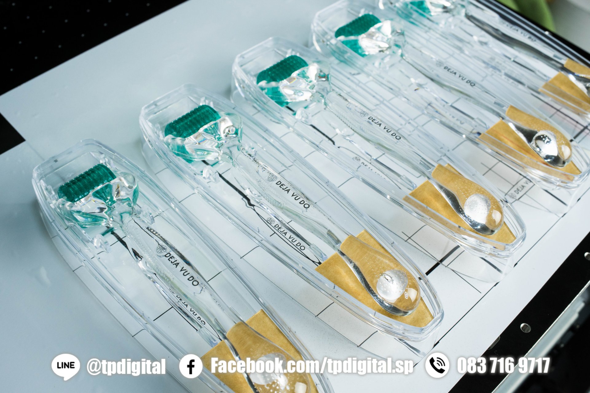 สกรีนโลโก้ลงบนด้ามจับเข็มกลิ้งหน้า ขนาดวัสดุ 20*3*3 เซนติเมตร ลาย DEJA VU DO สกรีนลาย 1 ด้าน 1 ตำแหน่ง สกรีนตรงด้ามจับ วัสดุเป็นพลาสติกใส เป็นเครื่องมือถือเข็มกลิ้งหน้า พื้นผิวโค้งเรียบ พิมพ์งานด้วยระบบดิจิตอล ปริ้นติ้งระบบยูวี สกรีนงานลงบน ผิวงานโดยตรง สกรีนได้ทุกสี ( ยกเว้น สีเงิน สีทอง ) ของงานพิมพ์ C M Y K W V Primer สามารถ ทำนูน เคลือบเงา เคลือบด้าน รองพื้นขาวได้ งานสกรีนแห้งทันที หลังจากที่สกรีนเสร็จ ด้วยหลอดไฟ LED ที่มีพลังวัตต์สูง จึงสามารถจับงานที่เสร็จแล้วได้ทันที โดยไม่ต้องรอสีแห้ง เหมือนงานอื่นๆ หมึก uv ของเรานั้นยังมีขีดความสามารถ ที่ไม่จำกัดอีกด้วย สามารถ ยึดเกาะวัสดุได้ทุกประเภท ไม่ว่าจะเป็น วัสดุที่มีความแข็ง หรือ ผิวซิลิโคนนิ่มอ่อนตัวก็สามารถสกรีนได้ และ ยึกเกาะได้ดี สีไม่ลอก ติดทนนาน