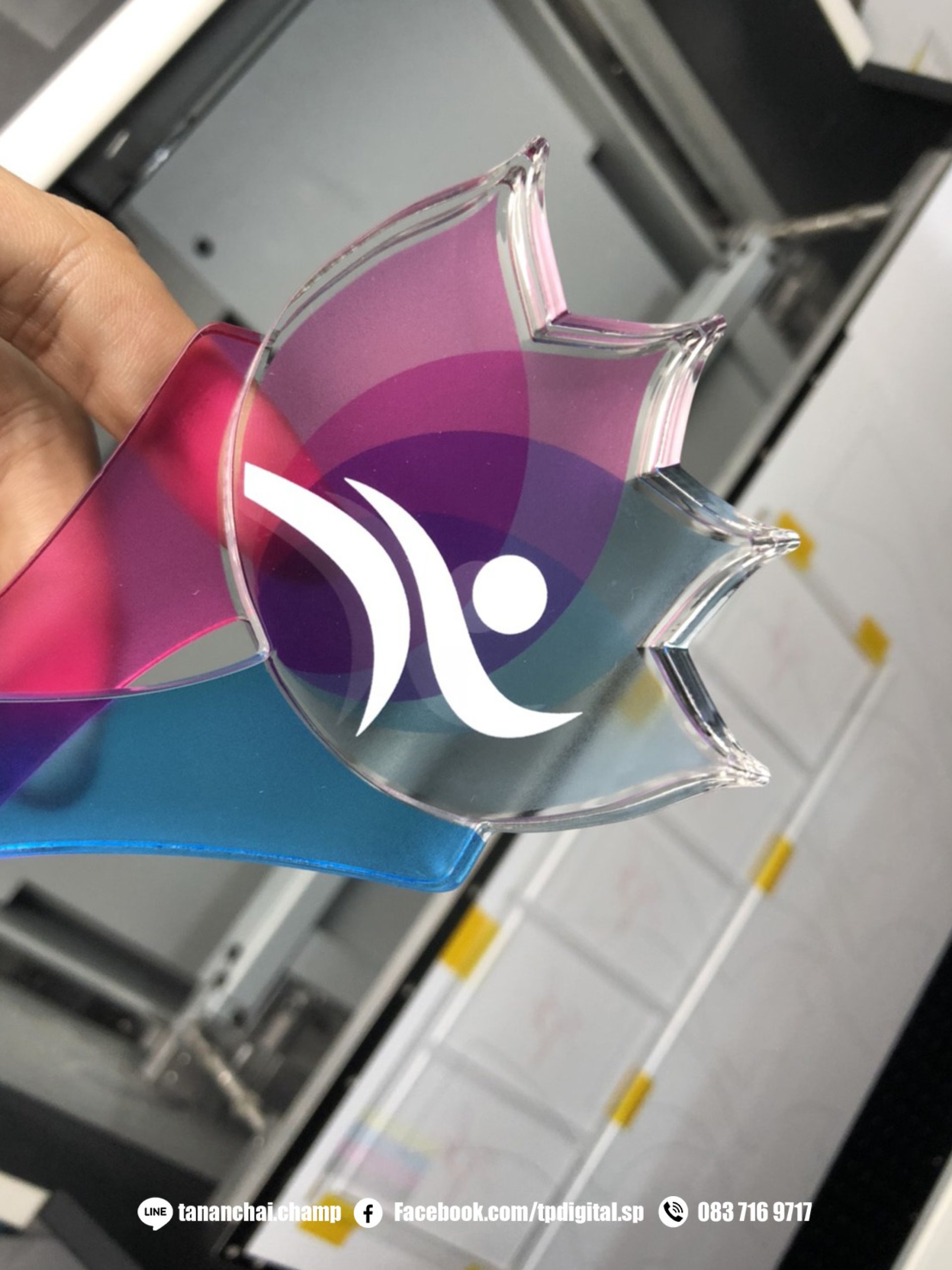 พิมพ์อะคริลิค งานพิมพ์โลโก้ลงบนโล่อะคริลิใส ทรงดอกบัว ลาย UBON MARATHON 2018 สกรีนลาย 2 ด้าน สกรีนลายเต็มชิ้นงาน รองขาวเฉพาะจุด วัสดุเป็นโล่อะคริลิคใส มีความแข็ง พื้นผิวเรียบใส พิมพ์งานด้วยระบบดิจิตอล ปริ้นติ้งระบบยูวี สกรีนงานลงบน ผิวงานโดยตรง สกรีนได้ทุกสี ( ยกเว้น สีเงิน สีทอง ) ของงานพิมพ์ C M Y K W V Primer สามารถ ทำนูน เคลือบเงา เคลือบด้าน รองพื้นขาวได้ งานสกรีนแห้งทันที หลังจากที่สกรีนเสร็จ ด้วยหลอดไฟ LED ที่มีพลังวัตต์สูง จึงสามารถจับงานที่เสร็จแล้วได้ทันที โดยไม่ต้องรอสีแห้ง เหมือนงานอื่นๆ หมึก uv ของเรานั้นยังมีขีดความสามารถ ที่ไม่จำกัดอีกด้วย สามารถ ยึดเกาะวัสดุได้ทุกประเภท ไม่ว่าจะเป็น วัสดุที่มีความแข็ง หรือ ผิวซิลิโคนนิ่มอ่อนตัวก็สามารถสกรีนได้ และ ยึกเกาะได้ดี สีไม่ลอก ติดทนนาน