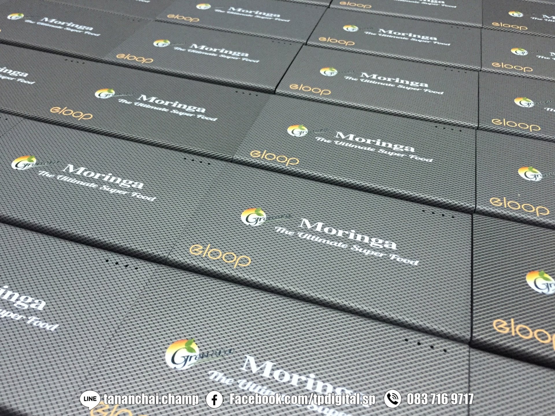 พิมพ์โลโก้บน Power Bank ยี่ห้อ eloop ลาย Moringa The Ultinate Super Food สกรีนโลโก้ 1 ตำแหน่ง 1 ด้าน วัสดุเป็นพาวเวอร์แบงค์สีเทา ลายเคฟล่า พื้นผิวขรุขระเล็กน้อย พิมพ์งานด้วยระบบดิจิตอล ปริ้นติ้งระบบยูวี สกรีนงานลงบน ผิวงานโดยตรง สกรีนได้ทุกสี ( ยกเว้น สีเงิน สีทอง ) ของงานพิมพ์ C M Y K W V Primer สามารถ ทำนูน เคลือบเงา เคลือบด้าน รองพื้นขาวได้ งานสกรีนแห้งทันที หลังจากที่สกรีนเสร็จ ด้วยหลอดไฟ LED ที่มีพลังวัตต์สูง จึงสามารถจับงานที่เสร็จแล้วได้ทันที โดยไม่ต้องรอสีแห้ง เหมือนงานอื่นๆ หมึก uv ของเรานั้นยังมีขีดความสามารถ ที่ไม่จำกัดอีกด้วย สามารถ ยึดเกาะวัสดุได้ทุกประเภท ไม่ว่าจะเป็น วัสดุที่มีความแข็ง หรือ ผิวซิลิโคนนิ่มอ่อนตัวก็สามารถสกรีนได้ และ ยึกเกาะได้ดี สีไม่ลอก ติดทนนาน